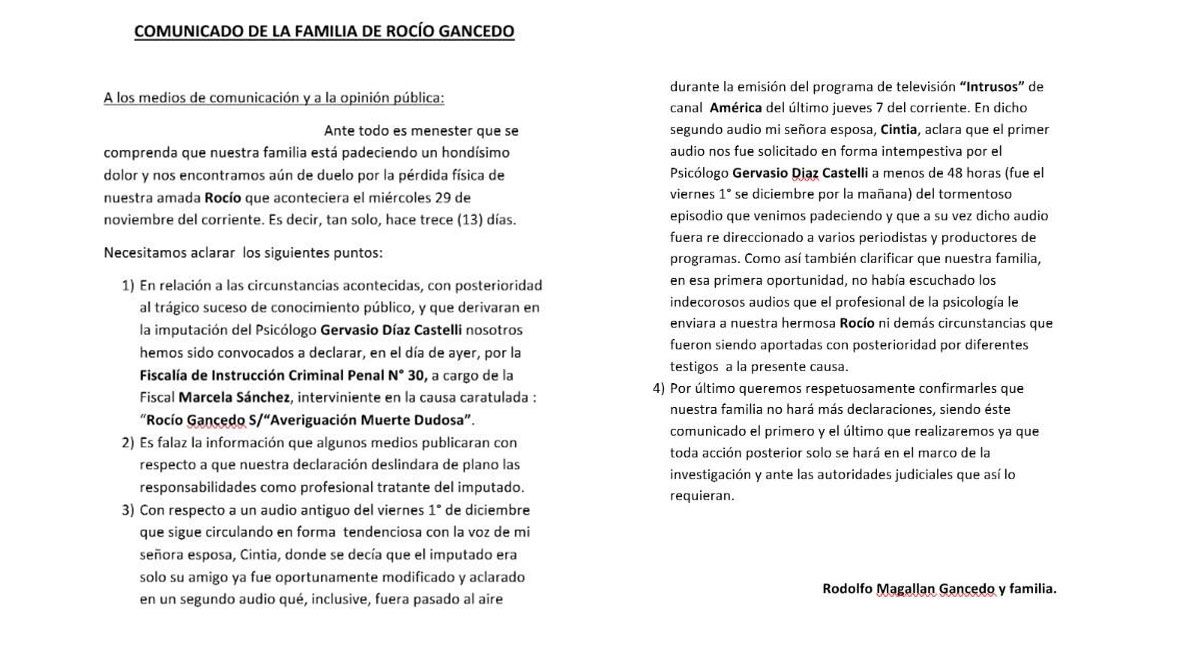El psicólogo Gervasio Díaz Castelli asistió a los familiares de Rocío Gancedo en las horas posteriores a su suicidio. Incluso acompañó al hermano de la modelo, Rodolfo Magallán, a reconocer el cuerpo en la morgue judicial. Y contuvo a su mamá, Graciela Gancedo.