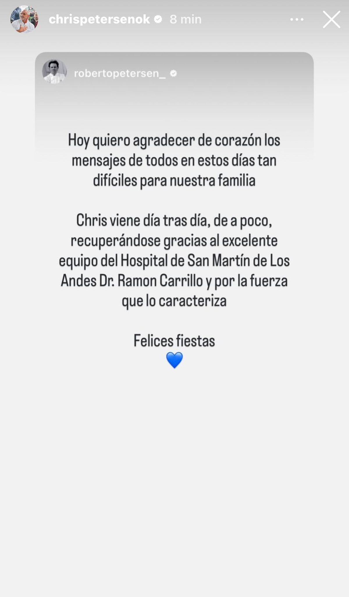 El texto fue compartido a través de las historias de Instagram del propio Petersen y tuvo como eje central el agradecimiento. “En esta Navidad, los Petersen nos sumamos a la jornada festiva en agradecimiento por la franca mejoría de Chris ”, expresaron, al tiempo que destacaron el compromiso y la labor del personal de salud que intervino desde el primer momento, tanto en Junín como en San Martín de los Andes, donde fue atendido inicialmente.