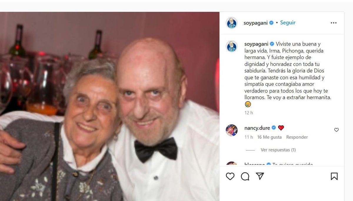 "Viviste una buena y larga vida, Irma, Pichonga, querida hermana. Y fuiste ejemplo de dignidad y honradez con toda tu sabiduría", indicó el periodista con una foto de los dos en su posteo.