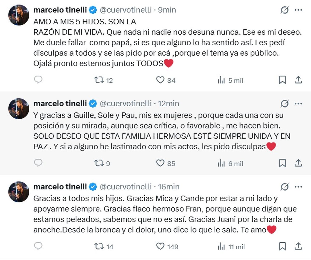 "Y gracias a Guille, Sole y Pau, mis ex mujeres , porque cada una con su posición y su mirada, aunque sea crítica, o favorable, me hacen bien. Solo deseo que esta familia hermosa esté siempre unida y en paz. Y si a alguno he lastimado con mis actos, les pido disculpas", continuó un movilizado Marcelo Tinelli.