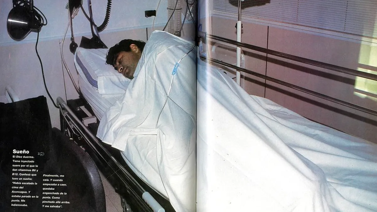 La imagen real de ese momento de la vida de Maradona fue tomada por el fotógrafo Jorge Luengo para la revista Gente, el 10 de enero del 2000. El ídolo había sido trasladado de Punta del Este al cuatro piso del Fleni, en Buenos Aires, con un pronóstico cardíaco reservado: arritmia de miocardio.