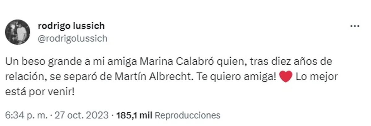 "Un beso grande a mi amiga Marina Calabró quien, tras diez años de relación, se separó de Martín Albrecht. Te quiero amiga! Lo mejor está por venir!", fue el mensaje del conductor de Socios del espectáculo.
