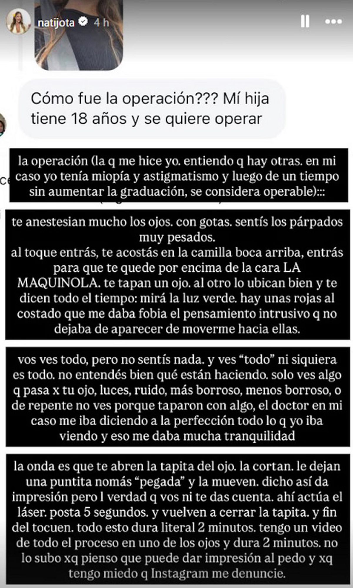 Ante la consulta de un seguidor sobre cómo es la operación en los ojos que se hizo, Nati Jota dio detalles de lo que sintió y en qué consiste el método.