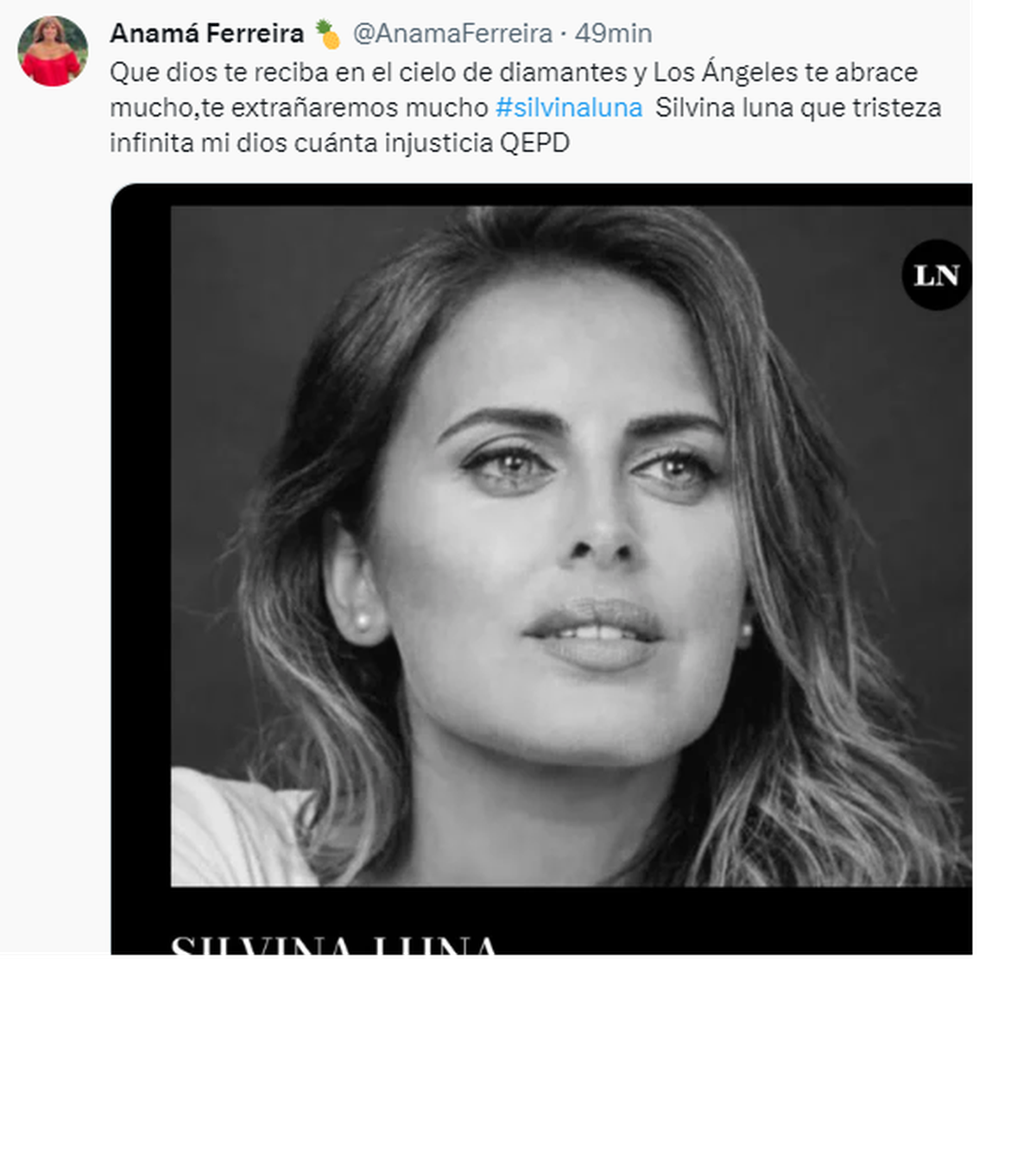 En medio de miles de mensajes por la muerte de la ex Gran Hermano, Anamá Ferreira añadió: "Que dios te reciba en el cielo de diamantes y Los Ángeles te abrace mucho, te extrañaremos mucho #silvinaluna. Silvina Luna, que tristeza infinita mi dios cuánta injusticia QEPD".