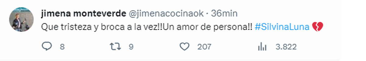 La famosa cocinera Jimena Monteverde se sumó a la lista de figuras, que acudieron a Twitter para manifestar su dolor: "Que tristeza y broca a la vez!! Un amor de persona!! #SilvinaLuna".