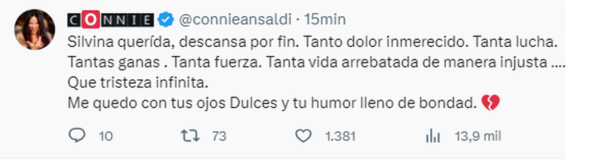 Connie Ansaldi, por su parte, escribió: "Silvina querida, descansa por fin. Tanto dolor inmerecido. Tanta lucha. Tantas ganas . Tanta fuerza. Tanta vida arrebatada de manera injusta... Que tristeza infinita. Me quedo con tus ojos Dulces y tu humor lleno de bondad".