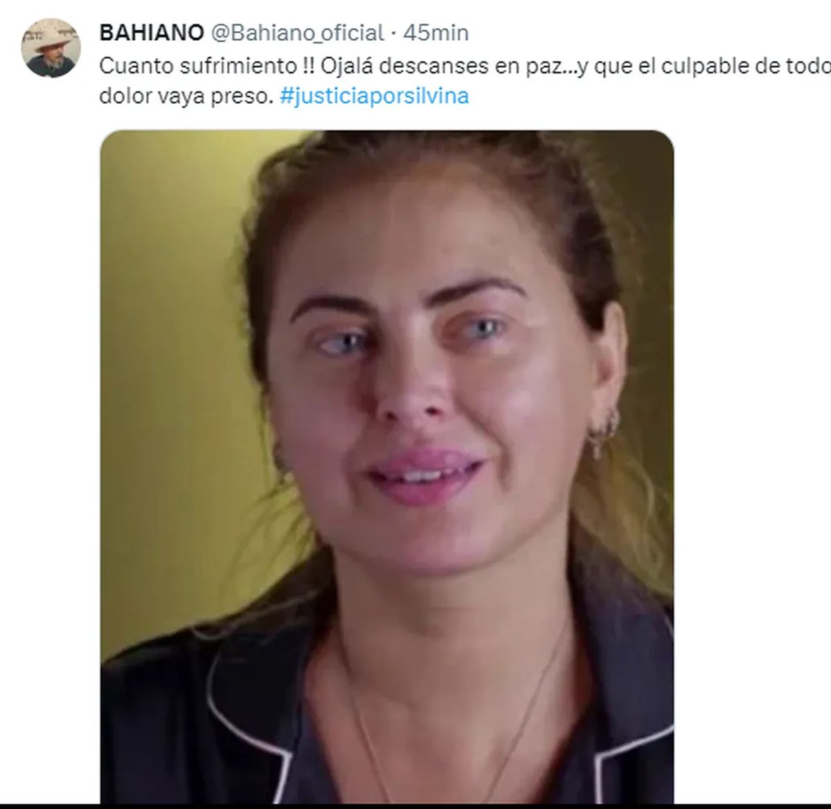 "Cuanto sufrimiento !! Ojalá descanses en paz...y que el culpable de todo tu dolor vaya preso. #justiciaporsilvina", dijo el ex líder de Los Pericos, El Bahiano, en su cuenta de Twitter.