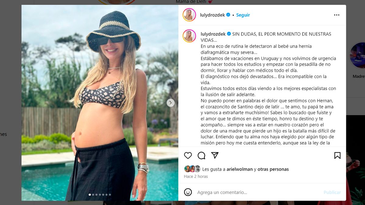 La modelo y su pareja estaban buscando su segundo hijo hace mucho y la alegría por la llegada del varón era inmensa. En sus redes, Luly expresó su profundo pesar por semejante pérdida. "Siempre te voy a amar y desde donde estés serás mi angelito", manifestó.
