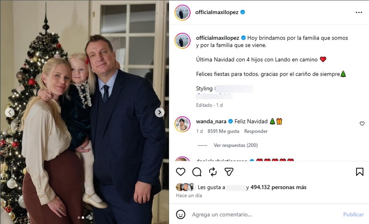 En este contexto, Maxi no dudó en compartir varias postales de la celebración familiar en Europa a través de su cuenta oficial de Instagram con un emotivo mensaje: “Hoy brindamos por la familia que somos y por la familia que se viene. Última Navidad con 4 hijos, con Lando en camino”, al que le sumó un emojis de corazones y arbolitos de navidad.