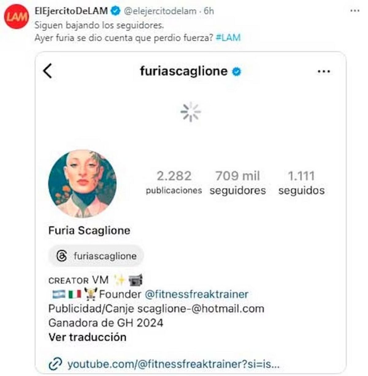"Siguen bajando los seguidores. Ayer Furia se dio cuenta que perdió fuerza?", se observó la cuenta en X del ciclo LAM.