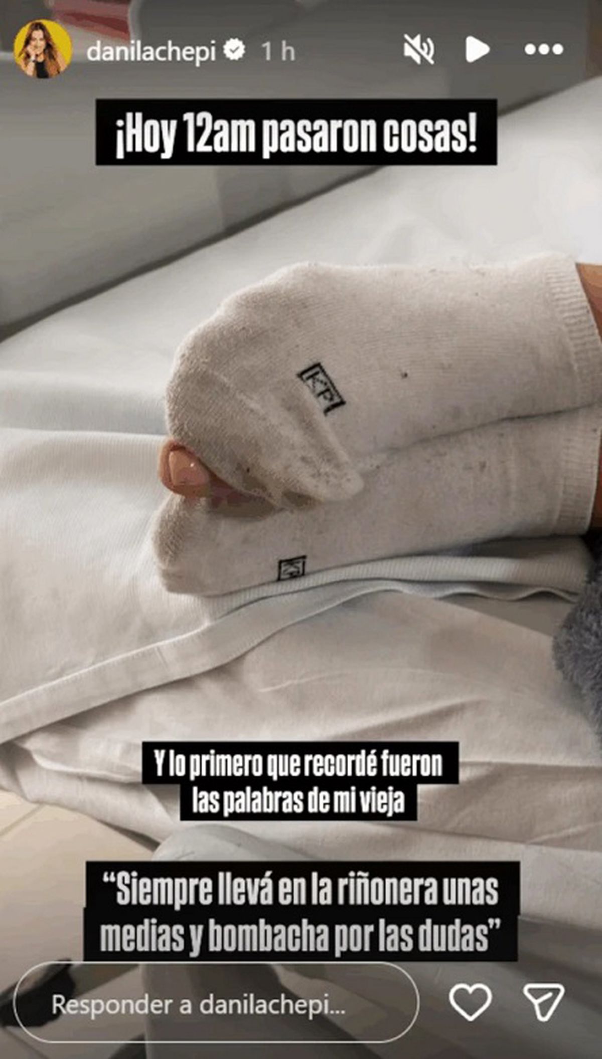 "¡Hoy 12 am pasaron cosas! Y lo primero que recordé fueron las palabras de mi vieja: ‘Siempre llevá en la riñonera medias y bombacha por las dudas’”, describió sobre la imagen.