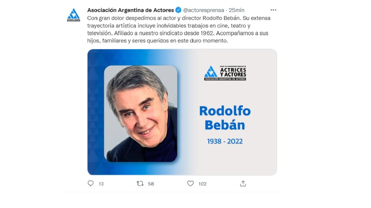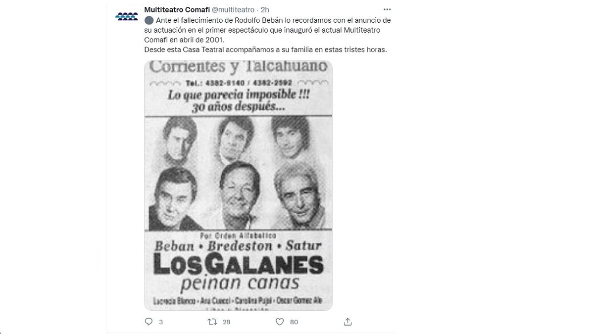 "Ante el fallecimiento de Rodolfo Bebán lo recordamos con el anuncio de su actuación en el primer espectáculo que inauguró el actual Multiteatro Comafi en abril de 2001. Desde esta Casa Teatral acompañamos a su familia en estas tristes horas", indicó Rottemberg.