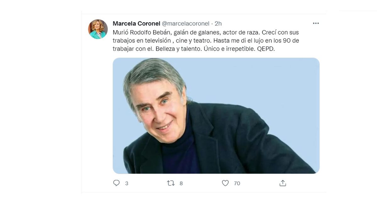 "Murió Rodolfo Bebán, galán de galanes, actor de raza. Crecí con sus trabajos en televisión , cine y teatro. Hasta me di el lujo en los 90 de trabajar con el. Belleza y talento. Único e irrepetible. QEPD", recordó Coronel.
