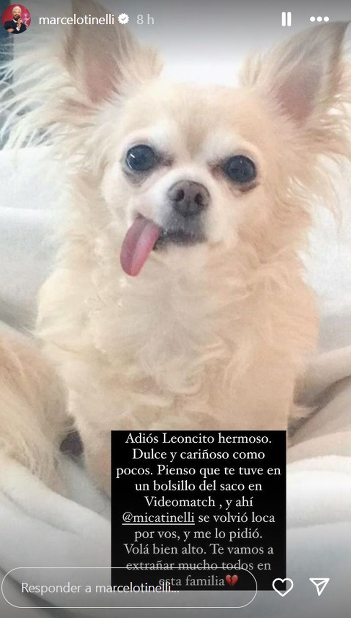 "Adiós Leoncito hermoso. Dulce y cariñoso como pocos. Pienso que te tuve en un bolsillo del saco en VideoMatch y ahí Mica se volvió loca por vos y me lo pidió", indicó el conductor junto a una foto del perro.
