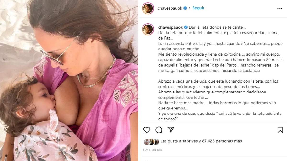 "Dar la teta donde se te cante… Dar la teta porque la teta alimenta, porque la teta es seguridad, calma, da paz… Es un acuerdo entre ella y yo… ¿Hasta cuándo? No sabemos… puede quedar poco o mucho…", comenzó su reflexión la modelo y conductora en Instagram.