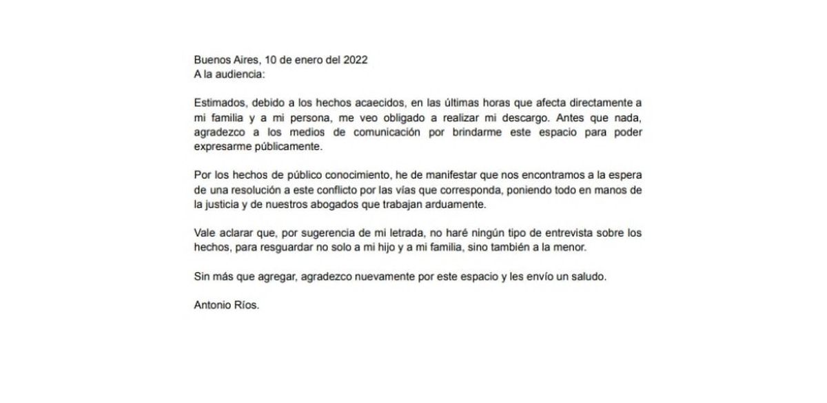 “Vale aclarar que, por sugerencia de mi letrada, no haré ningún tipo de entrevista sobre los hechos, para resguardar no solo a mi hijo y a mi familia, sino también a la menor. Sin más que agregar, agradezco nuevamente por este espacio y les envío un saludo”, cerró el artista.