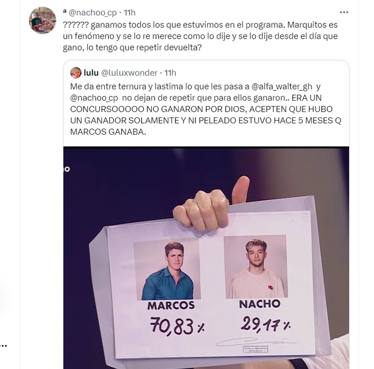 "Dije que 'ganamos' todos los que estuvimos en el programa. Marquitos es un fenómeno y se lo re merece, como lo dije y se lo dije desde el día que ganó, ¿lo tengo que repetir?", disparó con furia Nacho desde su cuenta de Twitter.
