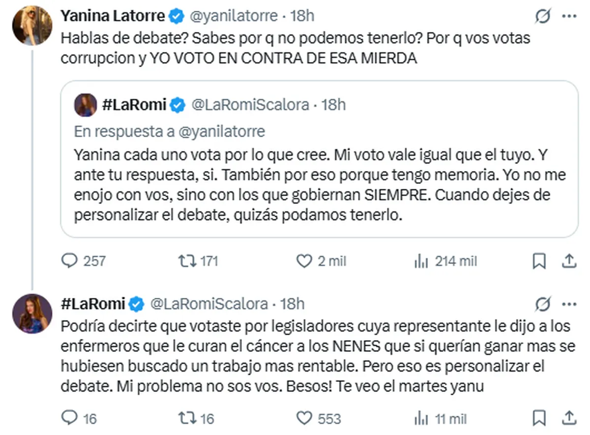 Este domingo 26 de octubre se llevaron a cabo las elecciones legislativas en Argentina, en las que se eligieron Diputados Nacionales en todo el país y Senadores Nacionales en Capital Federal y en las provincias de Chaco, Entre Ríos, Neuquén, Río Negro, Salta, Santiago del Estero y Tierra del Fuego. En medio de la jornada electoral, Yanina Latorre y Romina Scalora protagonizaron un fuerte cruce en redes sociales que rápidamente se volvió viral.