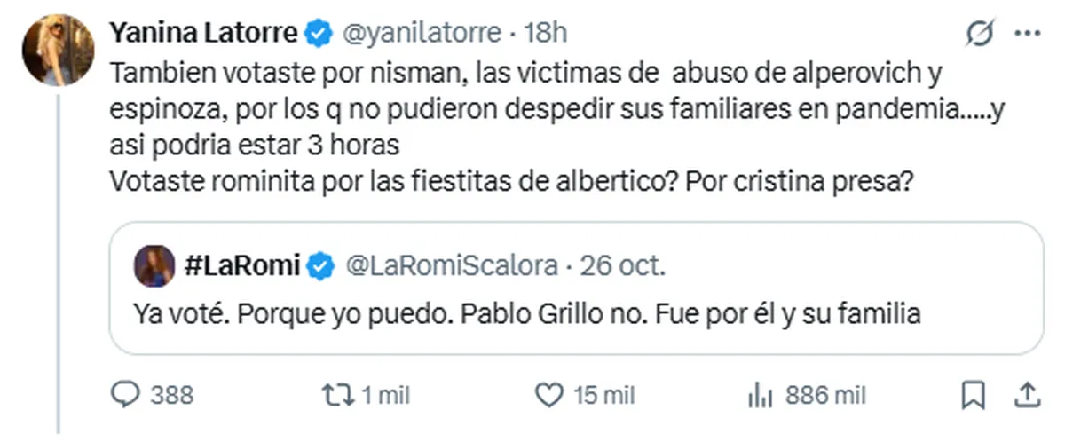 Todo comenzó cuando la nueva panelista de LAM (América TV) escribió en su cuenta de X (ex Twitter): “Ya voté. Porque yo puedo. Pablo Grillo no. Fue por él y su familia”. Al ver el mensaje, Yanina Latorre no dudó en responder con ironía: “También votaste por Nisman, por las víctimas de abuso de Alperovich y Espinoza, por los que no pudieron despedir a sus familiares en la pandemia. ¿Votaste, Rominita, por las fiestitas de Albertico? ¿Por Cristina presa?”.