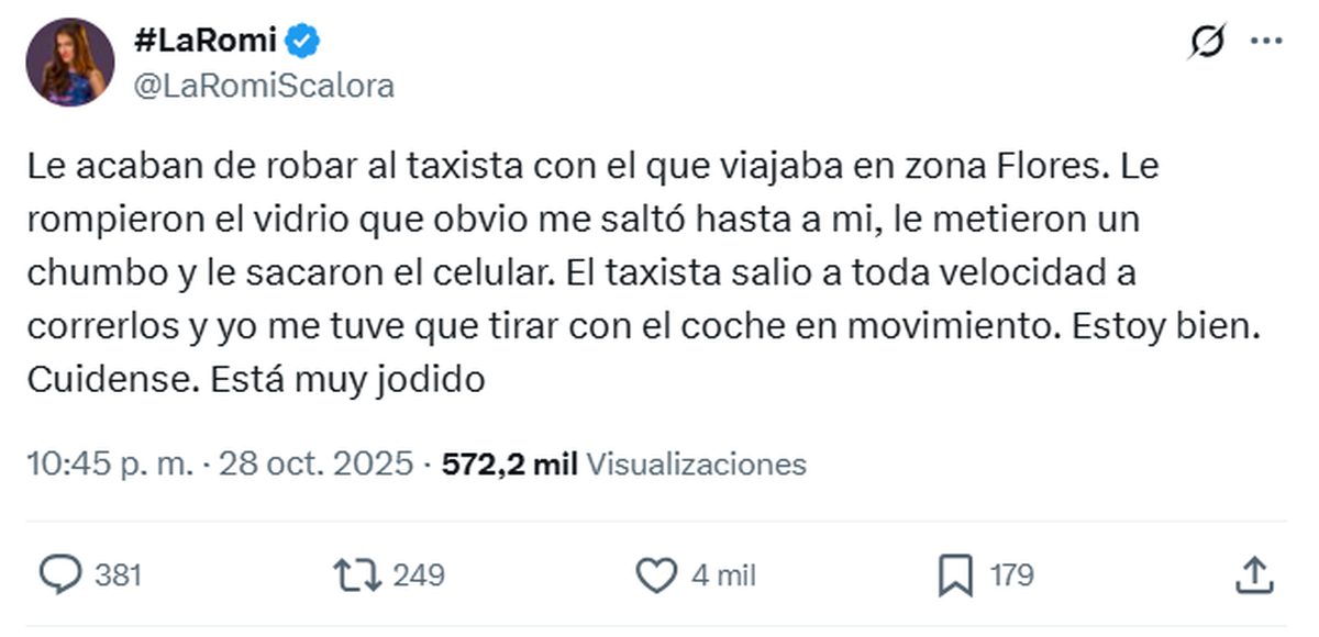 En las últimas horas, en su cuenta de X, la panelista de LAM, Romina Scalora, relató el dramático hecho de inseguridad que le tocó presenciar.