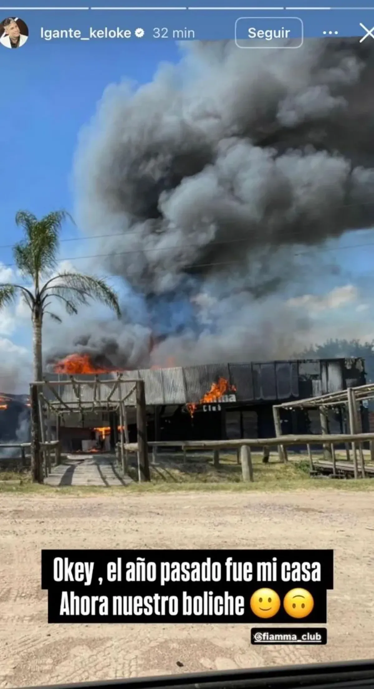 A través de una historia de Instagram, el cantante publicó una imagen impactante: un edificio envuelto en llamas, con una espesa columna de humo negro saliendo desde su interior. La postal estuvo acompañada por una frase que encendió todas las alarmas: “Okey, el año pasado fue mi casa, ahora nuestro boliche”, junto a la ubicación del lugar. Según se desprende de la publicación, se trataría de Fiamma Club, una discoteca ubicada sobre la avenida Dr. Ricardo Balbín al 2500, en la ciudad de General Rodríguez.