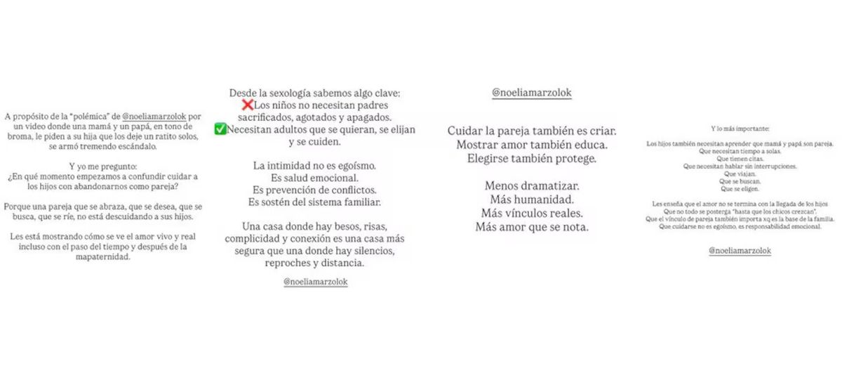 Sin embargo, eso fue solo la antesala del fuerte descargo que vendría después. En primer lugar, Noelia citó a la sexóloga Agustina Soria Gómez, quien analizó su caso y puso el foco en la importancia de no relegar el vínculo de pareja cuando llegan los hijos. En su reflexión, la especialista cuestionó la idea de que priorizar a los niños implique dejar de lado la relación amorosa y se preguntó en qué momento se empezó a confundir el cuidado parental con el abandono de la pareja.