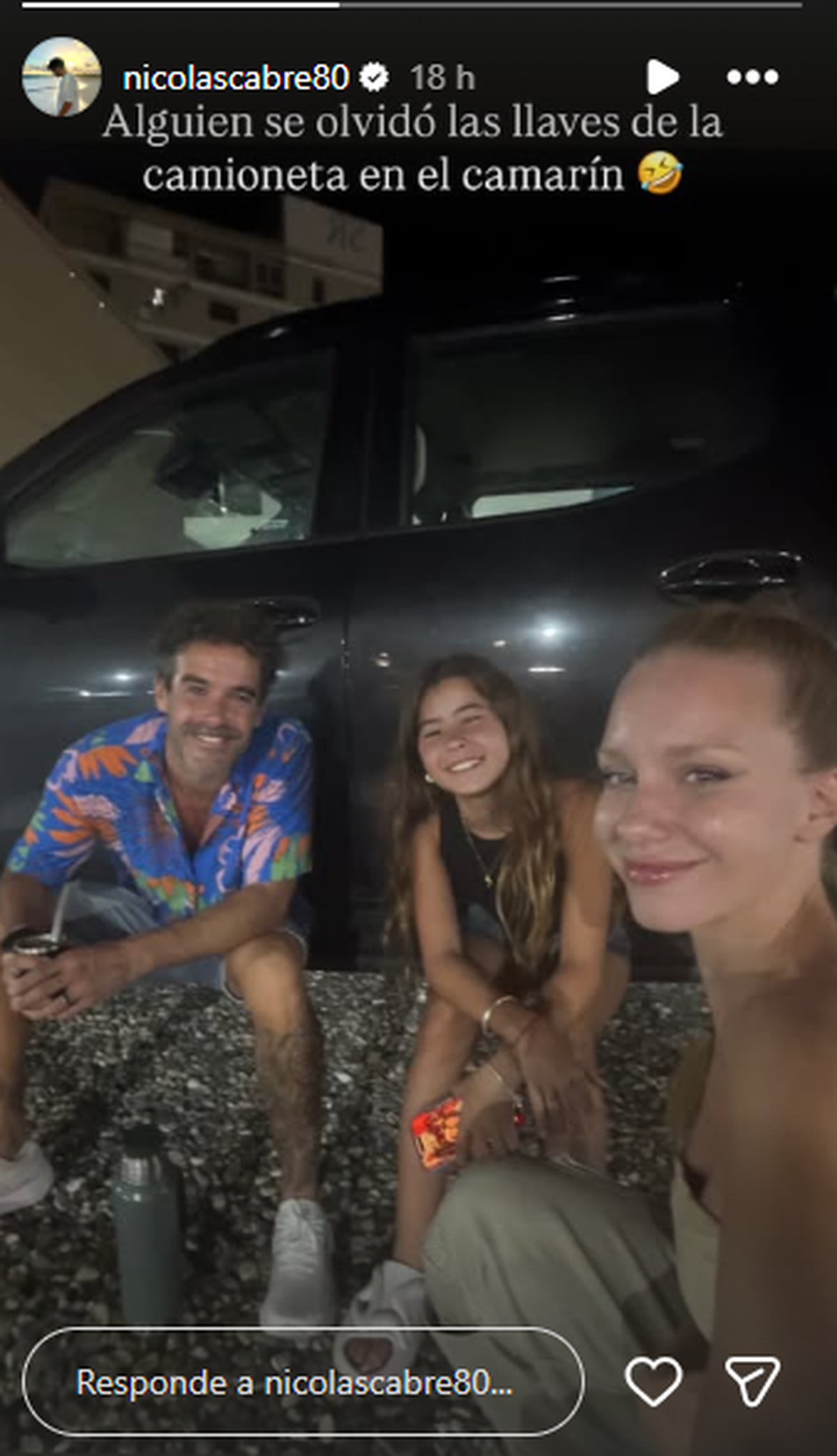 Sentados a un costado del rodado, lejos de dramatizar el contratiempo que podría haberles demorado los planes, eligieron tomárselo con calma y buen humor. "Alguien se olvidó las llaves de la camioneta en el camarín", escribió el actor en la historia junto a un emoji riéndose.