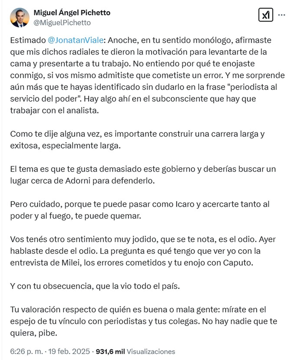 Miguel Ángel Pichetto recogió el guante rápido y compartió un duro mensaje en X contra el periodista luego de la editorial donde lo cuestionó: "Estimado @JonatanViale: Anoche, en tu sentido monólogo, afirmaste que mis dichos radiales te dieron la motivación para levantarte de la cama y presentarte a tu trabajo".