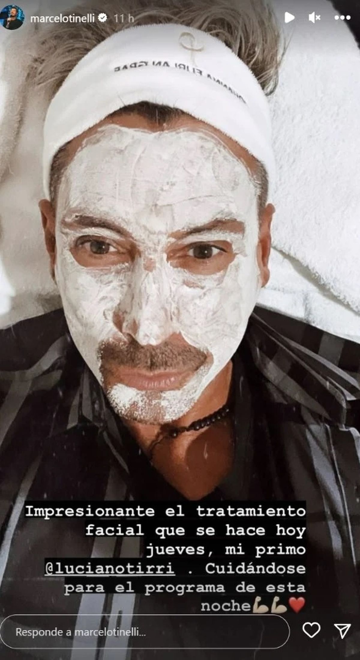 "Impresionante el tratamiento facial que se hace hoy mi primo, cuidándose para el programa de esta noche", expresó Marcelo Tinelli a través de sus historias de Instagram.