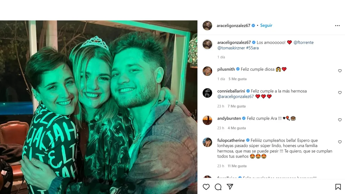 González vivió una linda noche rodeada de las personas más cercanas y también estuvieron sus hijos: Florencia Torrente y Toto Kirzner, a quienes les dedicó un especial posteo: "Los amoooo!", reflejó.