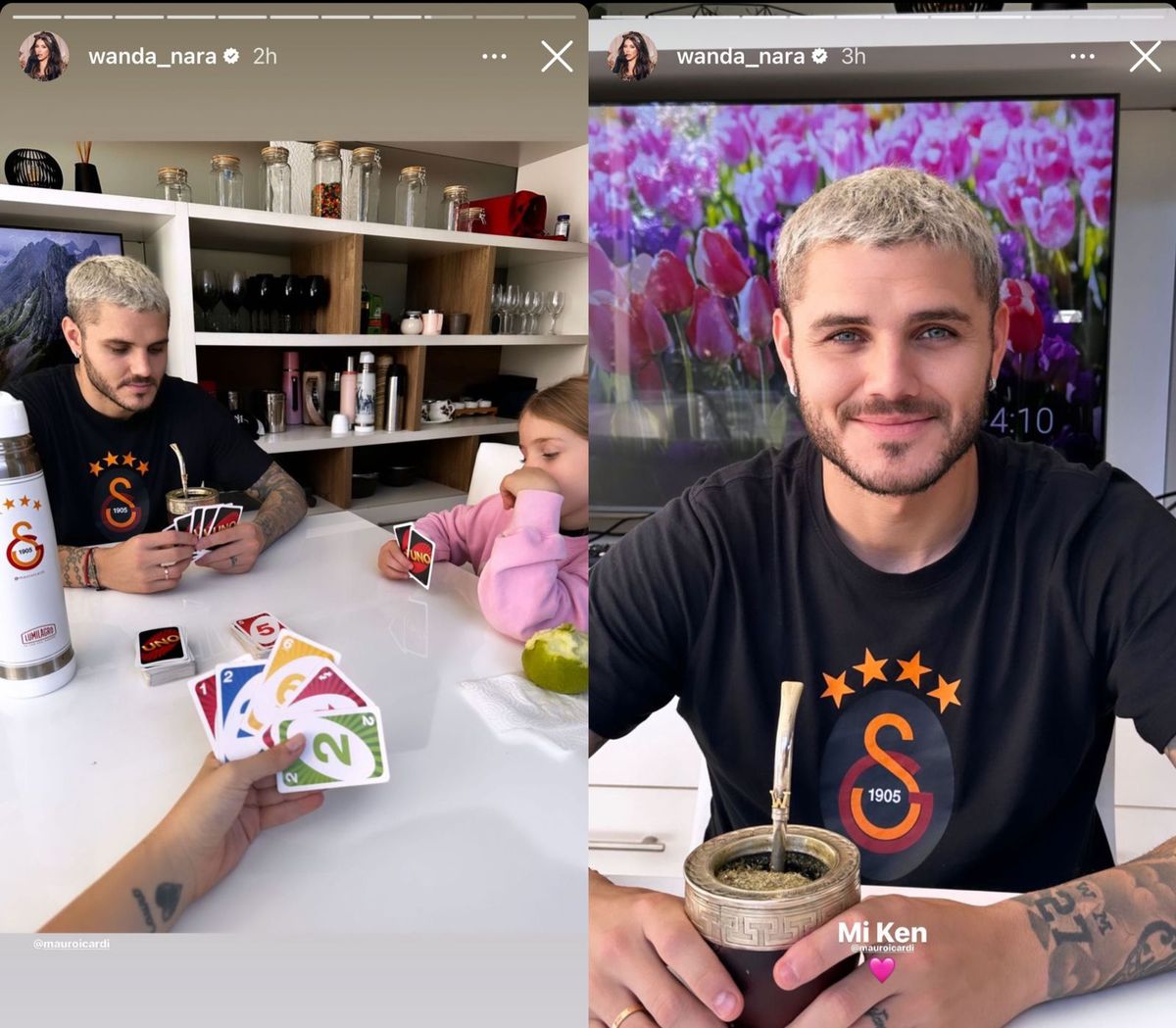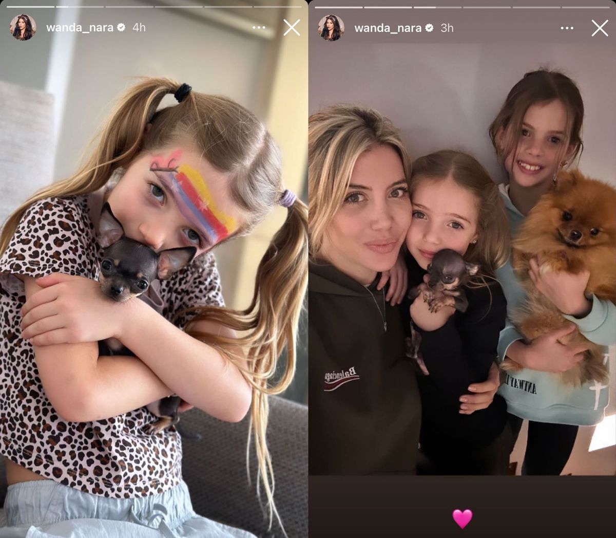 La imagen fue publicada en las historias de Wanda, y se la puede ver mirando sonriente a cámara y muy cercana a sus hijas, que sostienen muy felices a sus mascotas.