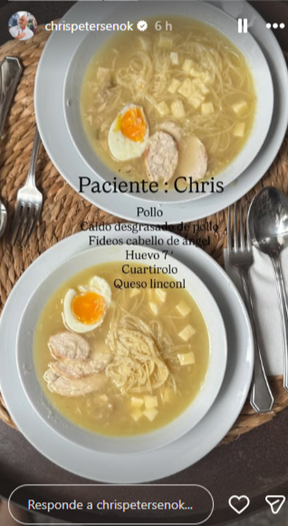 “Paciente: Cris. Pollo, caldo desgrasado de pollo, fideos cabello de ángel, huevo 7′, cuartirola, queso lincoln ”, escribió Pertersen en el posteo.