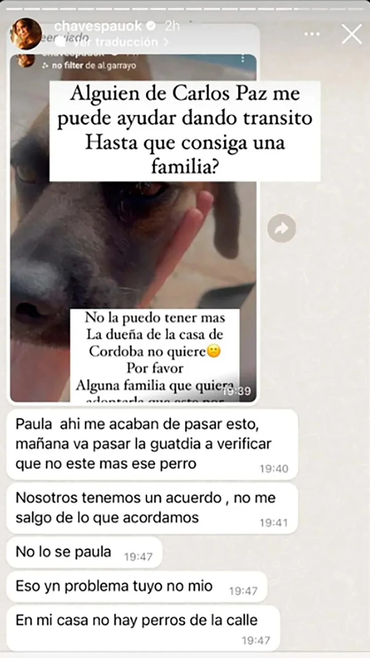 La propietaria se enteró que Paula hizo esa publicación y no dudó en escribirle. "Paula ahí me acaban de pasar esto. Mañana va a pasar la guardia a verificar que no esté más ese perro. Nosotros tenemos un acuerdo, no me salgo de lo que acordamos. Es un problema tuyo, no mío. En mi casa no hay perros de la calle”, le dijo la mujer a la protagonista de Un plan perfecto.