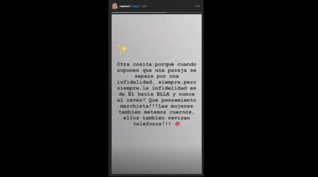 Y agregó: "Otra cosita. ¿Por qué cuando suponen que una pareja se separa por una infidelidad, siempre -pero siempre- la infidelidad es de él hacia ella y nunca al revés? ¡¡¡Qué pensamiento machista!!! Las mujeres también metemos cuernos, ellos también revisan teléfonos".