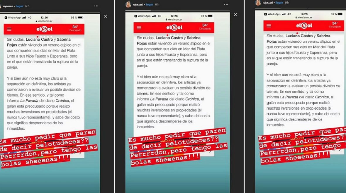 Rojas, además, salió a desmentir que haya una división de bienes con el actor, ante una publicación que sostenía que el actor estaría preocupado por una serie de inversiones inmobiliarias que realizó y de las que debería desprenderse.