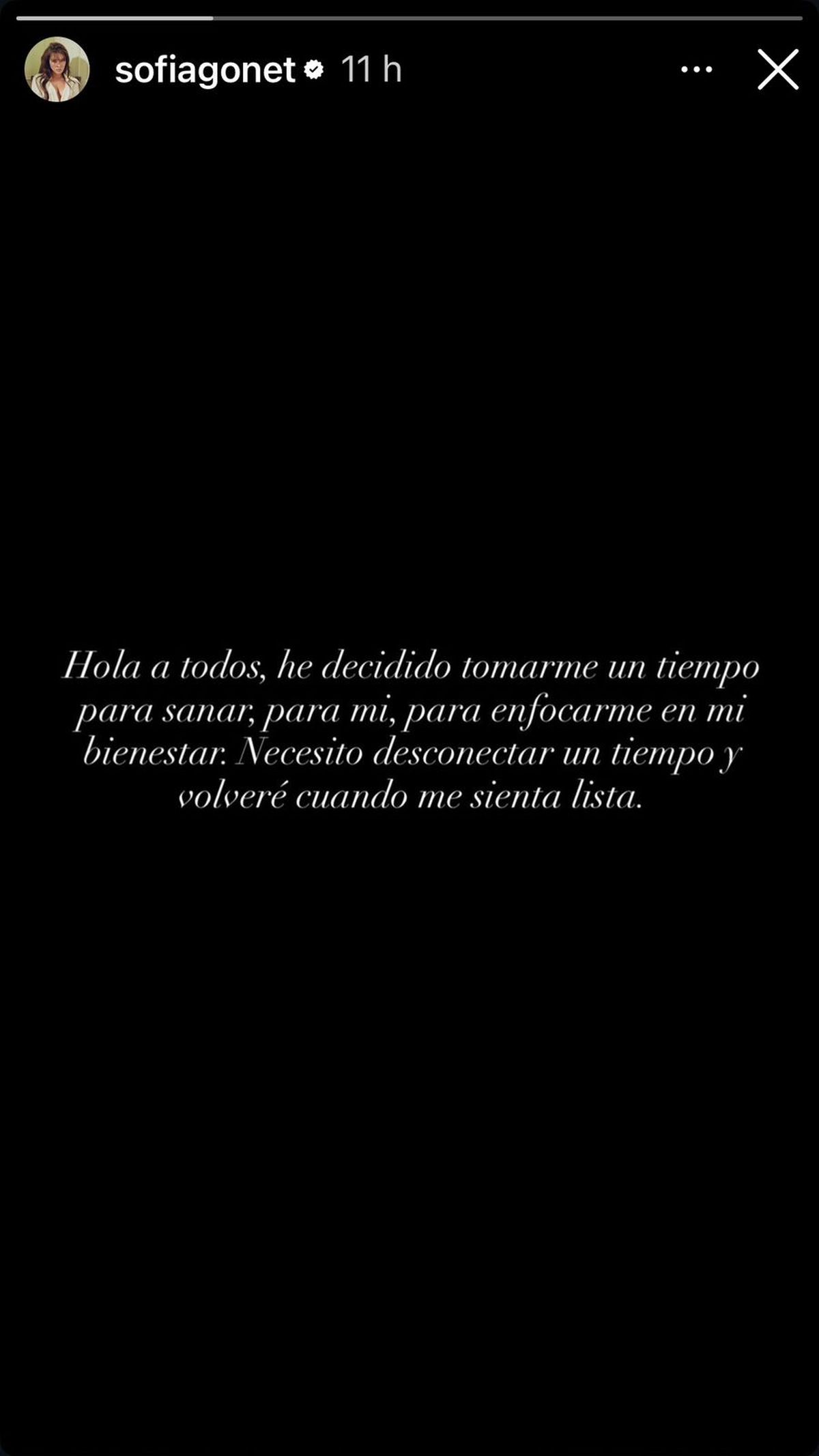 "Hola a todos, he decidido tomarme un tiempo para sanar, para mi, para enfocarme en mi bienestar. Necesito desconectar un tiempo y volveré cuando me sienta lista", informó en una reciente historia virtual con fondo negro publicada durante la madrugada de este martes.