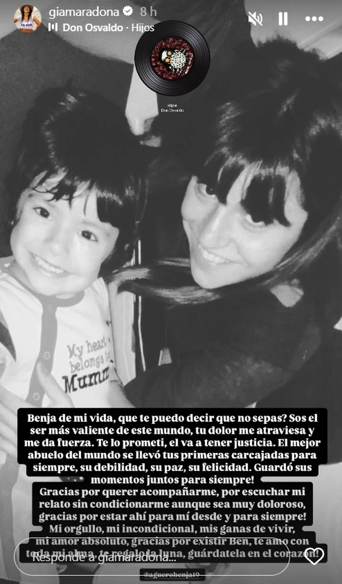 "Benja de mi vida, ¿Qué te puedo decir que no sepas? Sos el ser más valiente de este mundo, tu dolor me atraviesa y me da fuerza", comenzó su mensaje Gianinna Maradona con la canción Hijos de la banda Don Osvaldo.