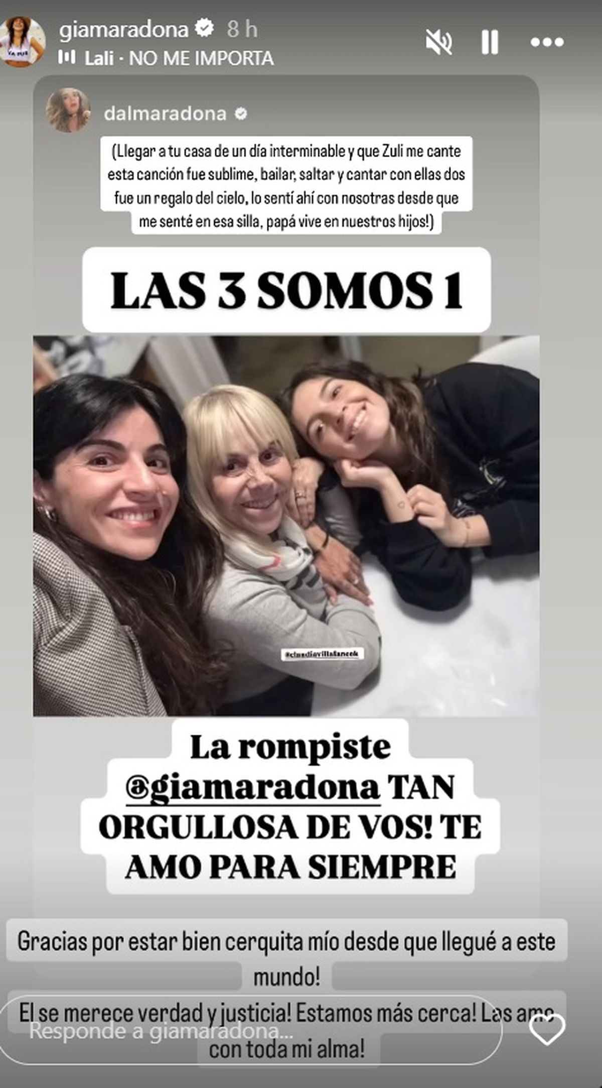 Por su parte, Dalma Maradona expresó desde las redes: "Las 3 somos 1. La rompiste, tan orgullosa de vos! Te amo para siempre. Él se merece la verdad y Justicia, estamos más cerca!".