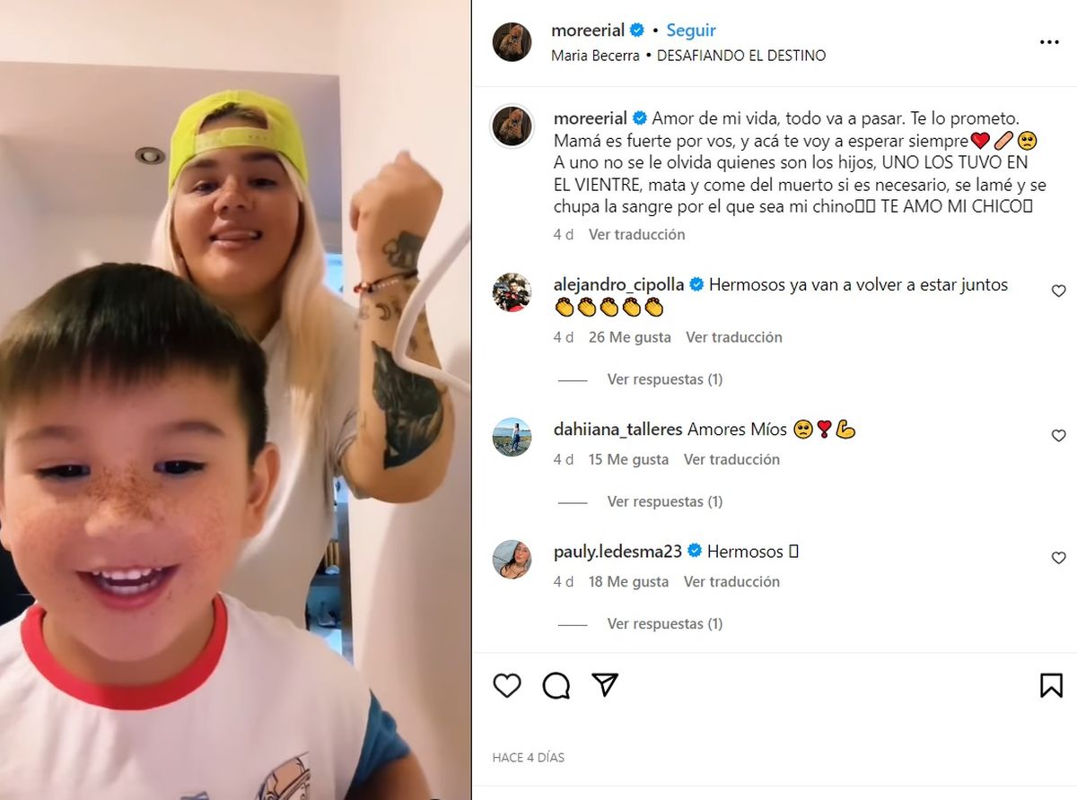 "Amor de mi vida, todo va a pasar. Te lo prometo. Mamá es fuerte por vos, y acá te voy a esperar siempre A uno no se le olvida quienes son los hijos, uno los tuvo en el vientre, mata y come del muerto si es necesario, se lame y se chupa la sangre por el que sea mi chino te amo mi chico", expresaba More hace unos días en un posteo.