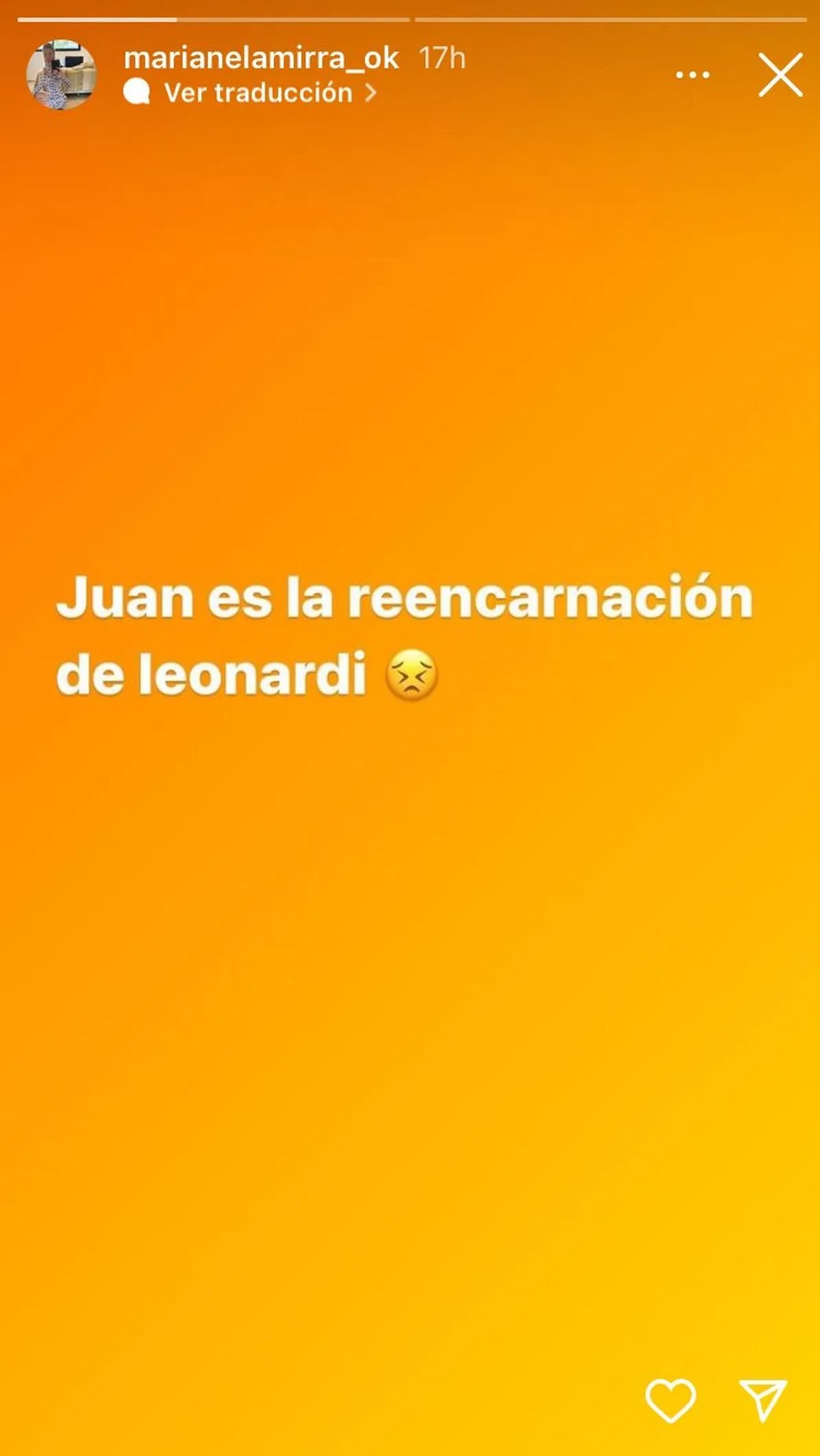 A través de su cuenta de Instagram, la ganadora de la edición 2007 de Gran Hermano, reconocida como la gran estratega del reality de Telefe, opinó sin filtros contra Juan Reverdito. "Juan es la reencarnación de Leonardi", escribió en sus stories, cerrando la frase con un emoji con los ojos cerrados.