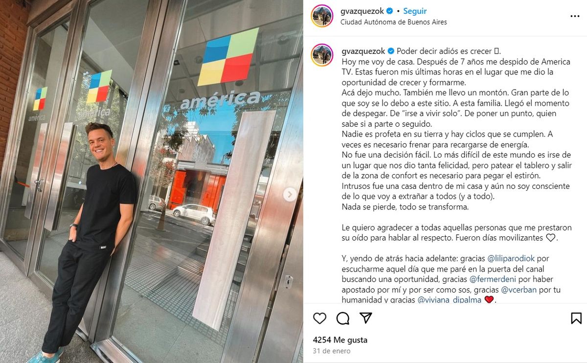 Horas más tarde, en un posteo en Instagram, el notero reiteró su agradecimiento. "Estas fueron mis últimas horas en el lugar que me dio la oportunidad de crecer y formarme. Acá dejo mucho. También me llevo un montón. Gran parte de lo que soy se lo debo a este sitio. A esta familia. Llegó el momento de despegar. De 'irse a vivir solo'. De poner un punto, quien sabe si a parte o seguido", concluyó.