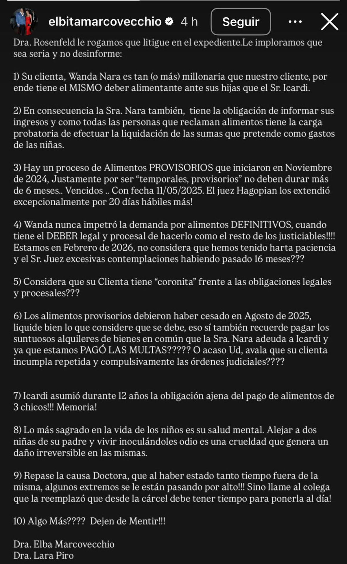 Elba Marcovecchio realizó un extenso descargo en su cuenta de X contra Ana Rosenfeld tras el cruce que protagonizaron por la cuota alimentaria de las hijas de Mauro Icardi y Wanda Nara.