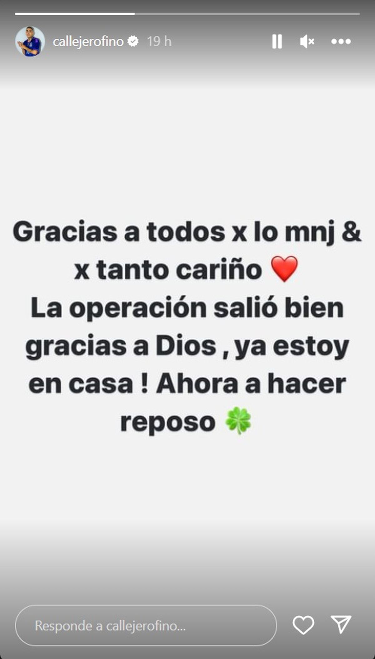 Y remarcó sobre su salud: "Yo estoy bien gracias a Dios, la operación fue un éxito y ya estoy en casa haciendo reposo!".