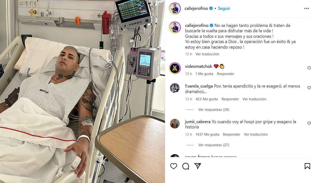 El cantante Callejero Fino compartió una foto de su internación y llevó tranquilidad tras ser operado con éxito por un cuadro de apendicitis y recibir el alta médica.