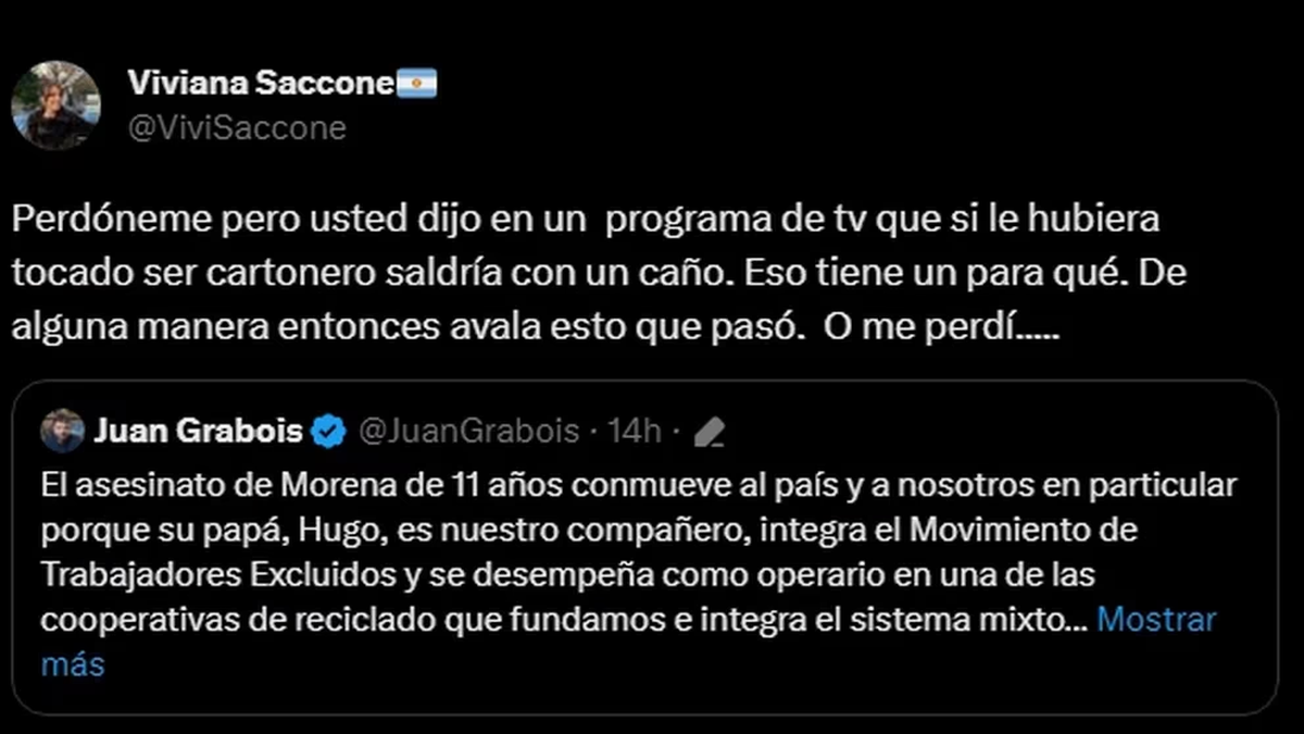 Después de leer los dichos de Grabois, Saccone le respondió por Twitter: “Perdóneme pero usted dijo en un programa de tv que si le hubiera tocado ser cartonero saldría con un caño. Eso tiene un para qué. De alguna manera entonces avala esto que pasó. O me perdí...”.
