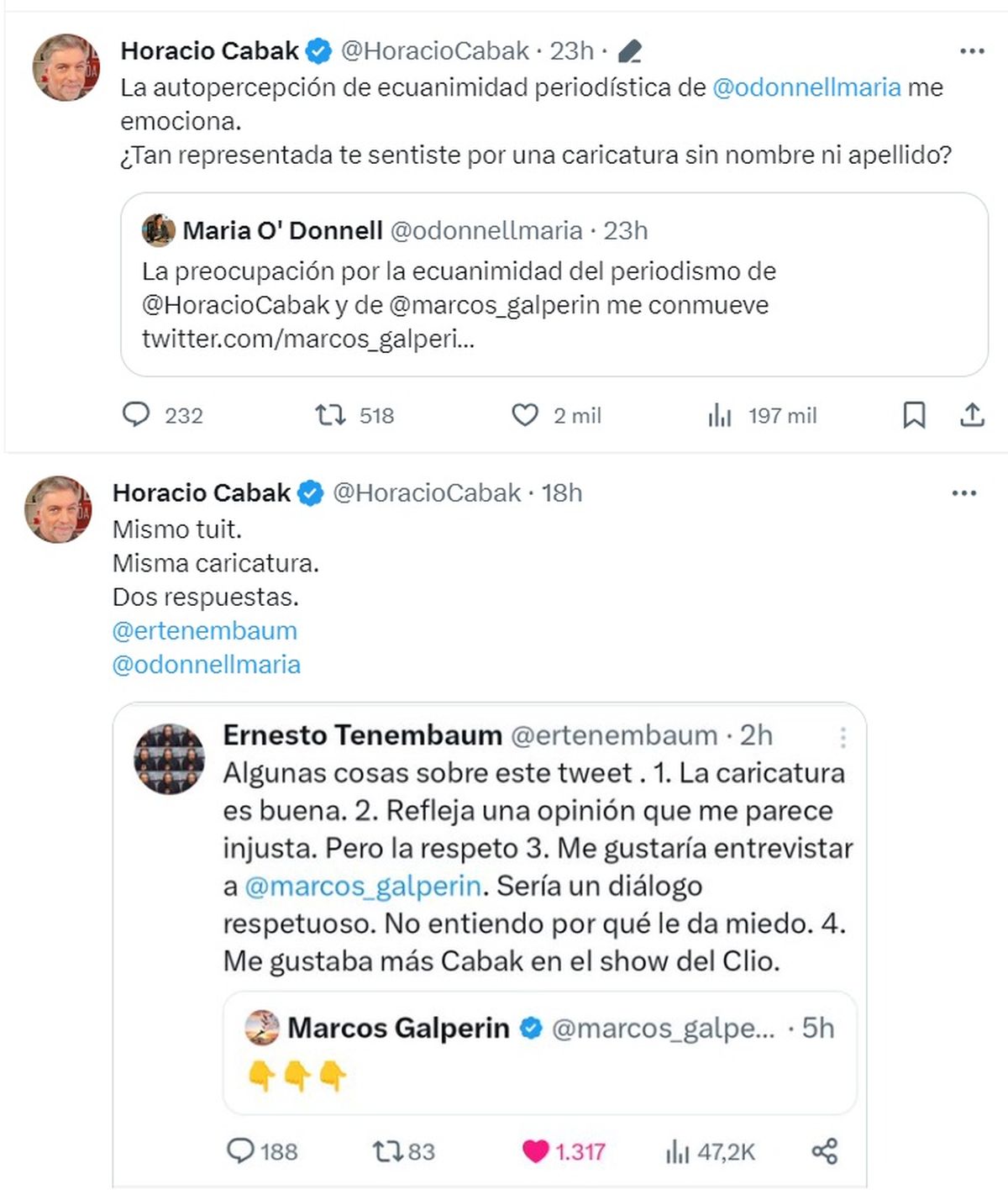 En las últimas horas se dio un tenso ida y vuelta desde la red social X, ex Twitter, entre María O' Donnell y Horacio Cabak, luego de que el conductor subió una caricatura con tinte política donde aparecía la periodista junto a su colega Ernesto Tenembaum.