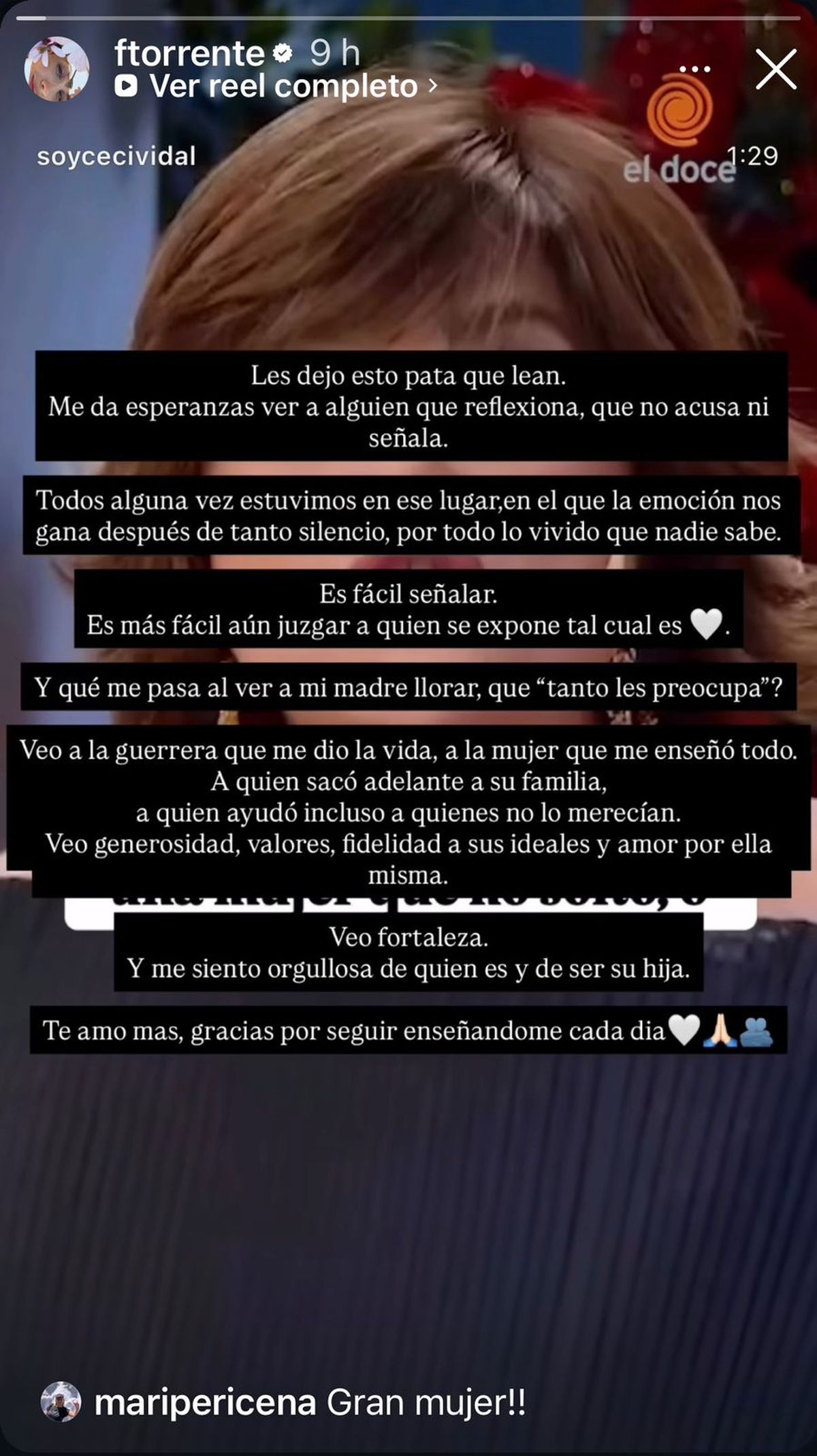 "Me da esperanzas ver a alguien que reflexiona, que no acusa ni señala. Todos alguna vez estuvimos en ese lugar, en el que la emoción nos gana después de tanto silencio, por todo lo vivido que nadie sabe. Es fácil señalar. Es más fácil aún juzgar a quien se expone tal cual es", fue el comienzo de un texto que posteó con imágenes del programa de Mirtha Legrand con su madre en la mesa.