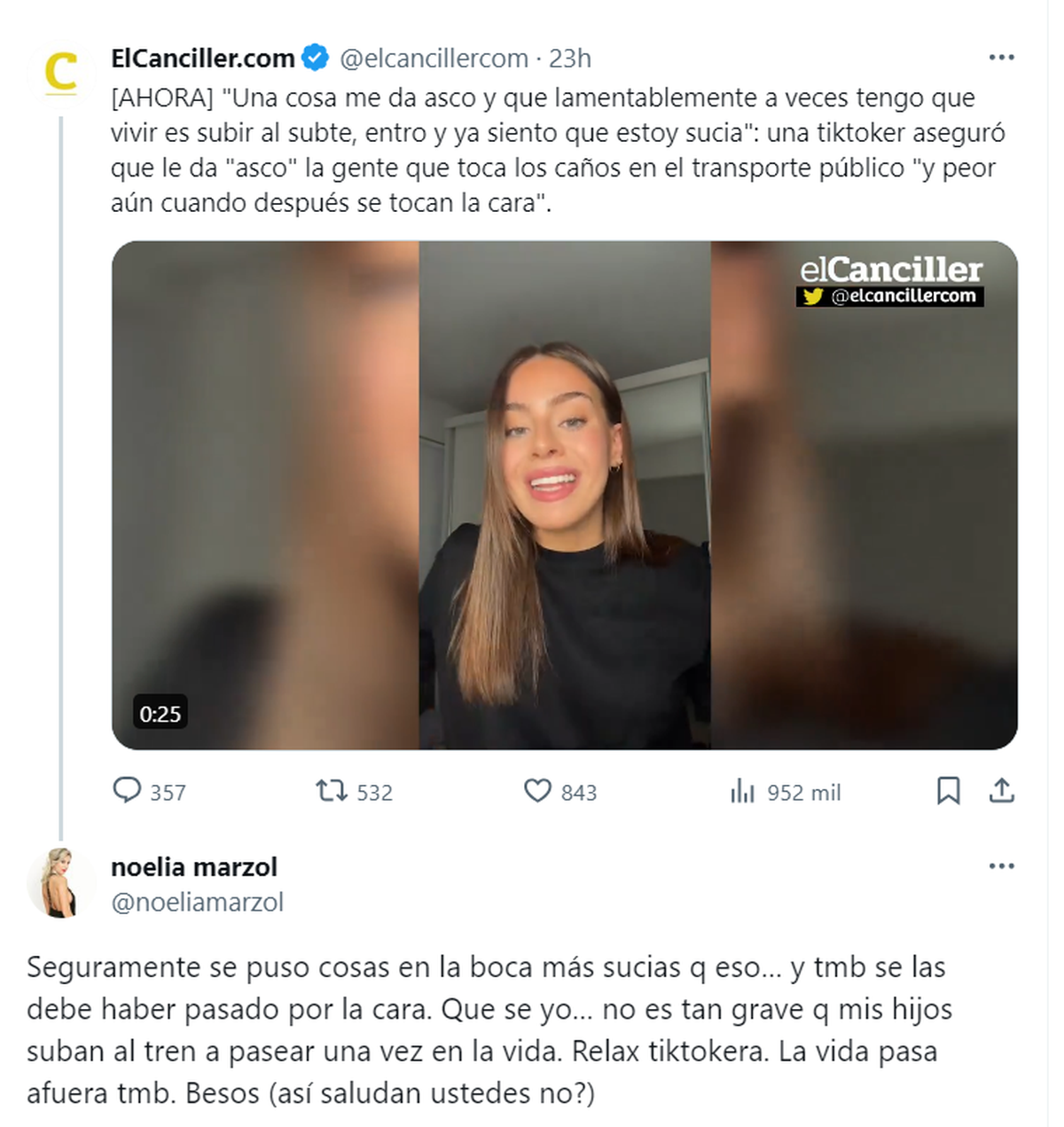 "Seguramente se puso cosas en la boca más sucias q eso… y también se las debe haber pasado por la cara. Que se yo… no es tan grave q mis hijos suban al tren a pasear una vez en la vida. Relax tiktokera. La vida pasa afuera también. Besos (así saludan ustedes no?)", expresó.