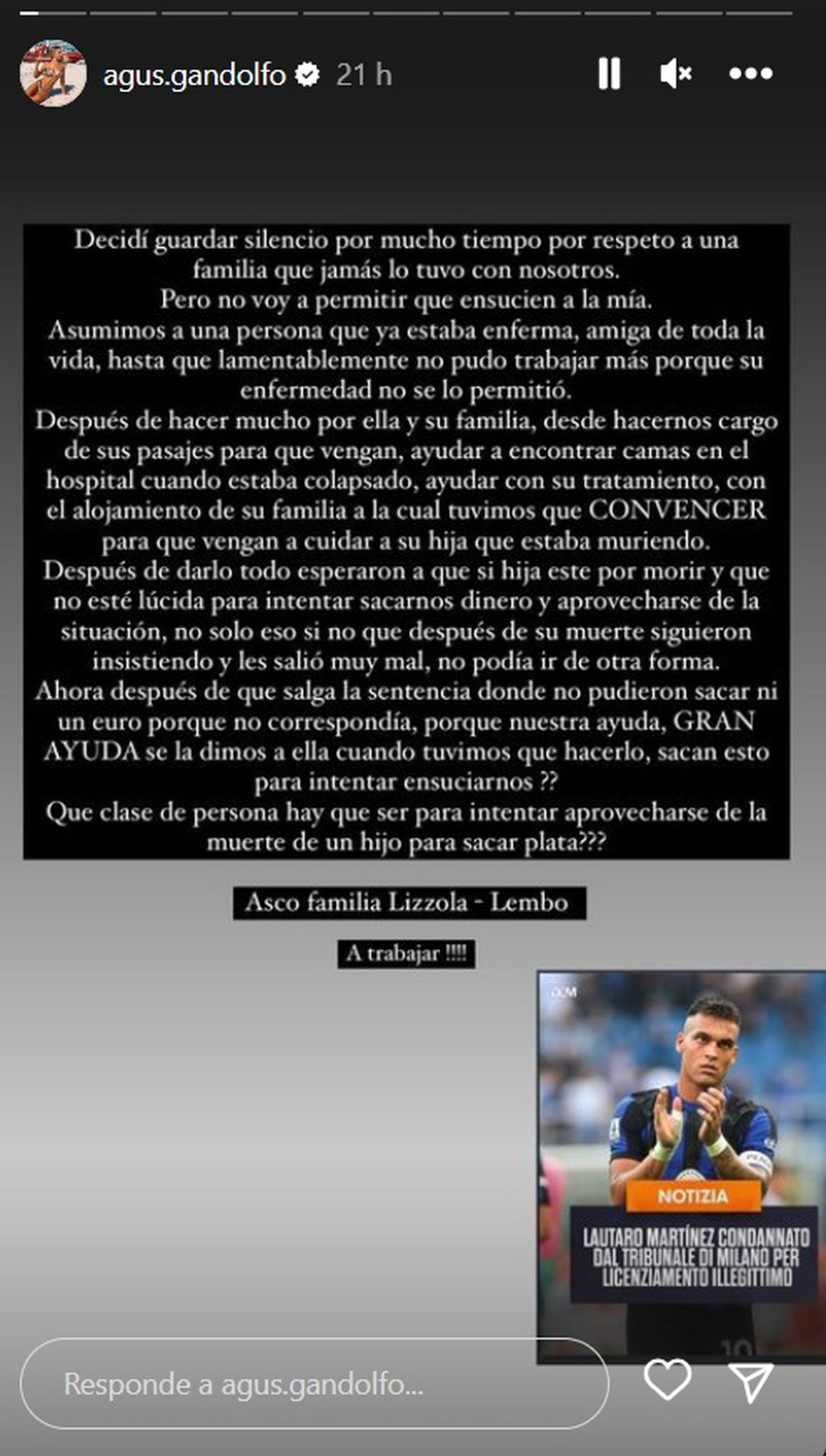 "Ahora después de que salga la sentencia donde no pudieron sacar ni un euro porque no correspondía, porque nuestra ayuda, GRAN AYUDA se la dimos a ella cuando tuvimos que hacerlo, sacan esto para intentar ensuciarnos?? Qué clase de persona hay que ser para intentar aprovecharse de la muerte de un hijo para sacar plata??? Asco familia Lizzola - Lembo. A trabajar !!!!", finalizó indignada.