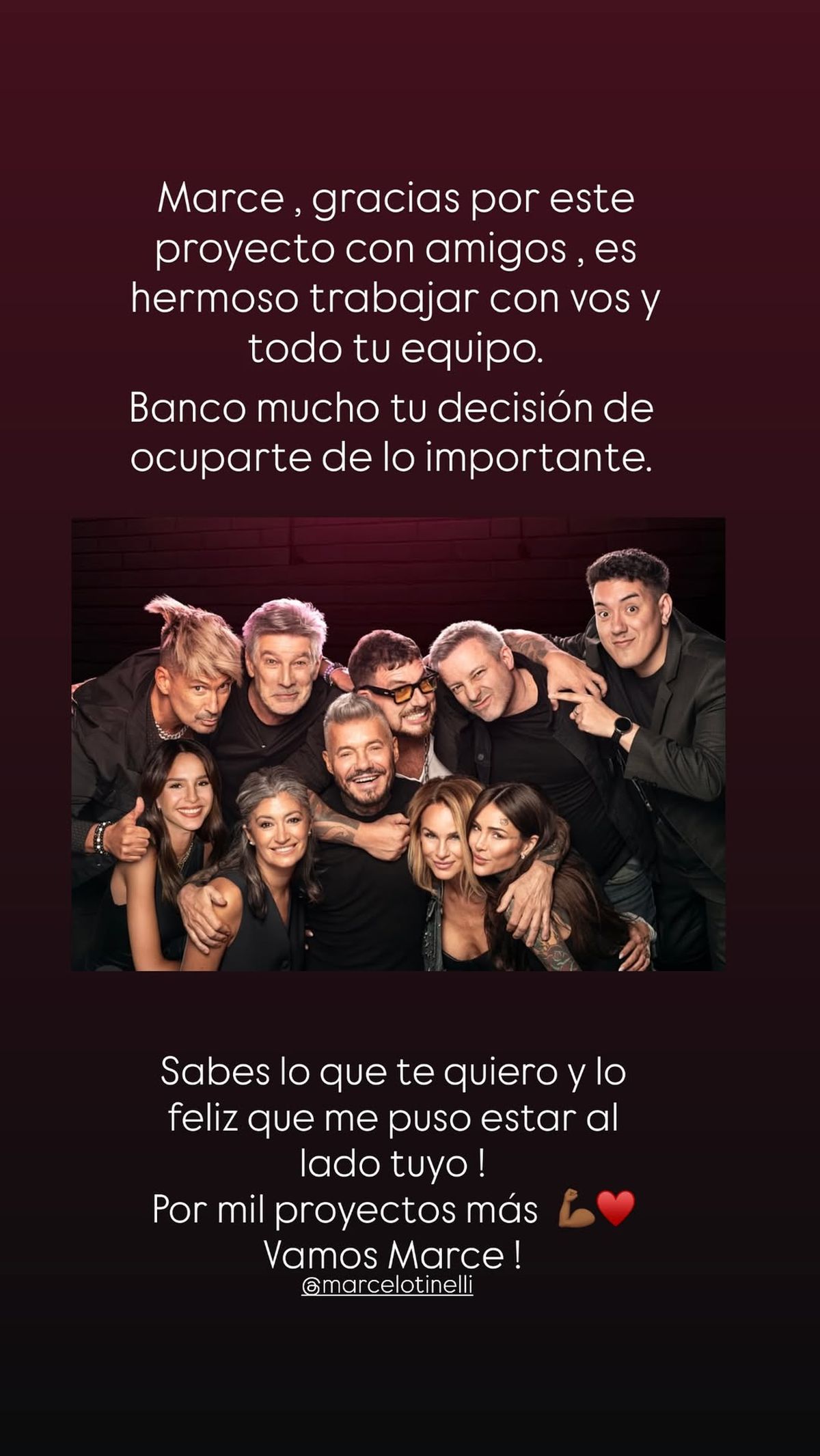 A través de una historia de Instagram, la conductora de Pasó en América expresó su gratitud y cariño hacia el animador. "Marce, gracias por este proyecto con amigos, es hermoso trabajar con vos y todo tu equipo", escribió.